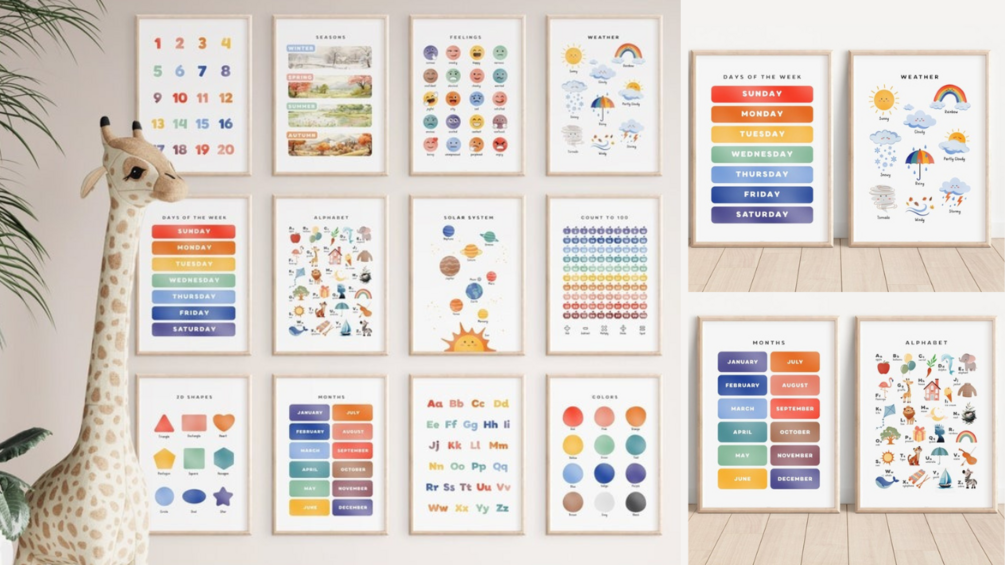 - Transform your learning space into a haven of education and creativity with our Set of 12 Educational Posters! Perfect for homeschooling, classroom decor, and toddler playrooms, these vibrant and engaging posters are designed to inspire young minds while adding a touch of Montessori charm to any environment.